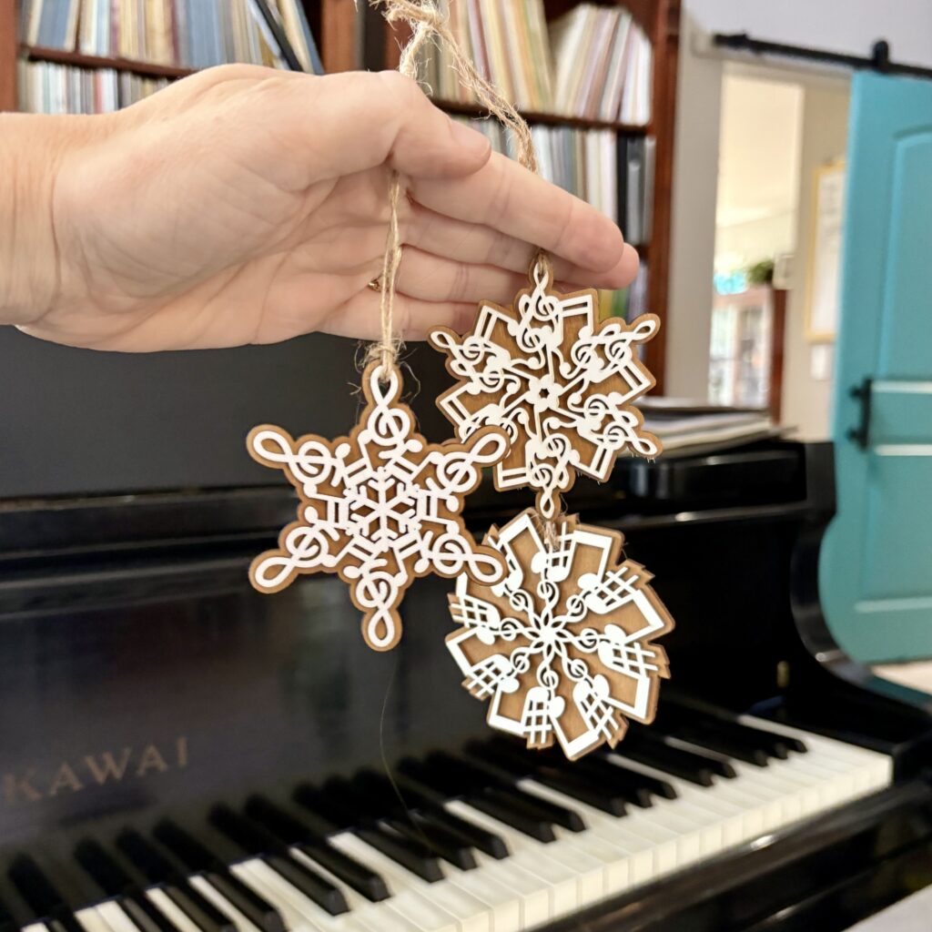 I’m delighted to have found the wooden music snowflake ornaments pictured below. [Update: these appear to be sold out currently on Amazon. Check back later to see if restocked, or scroll to the end of this post for other ornament recommendations.] Aren’t they elegant and fun?! I think my students will enjoy recognizing the music symbols hidden within the snowflake designs.