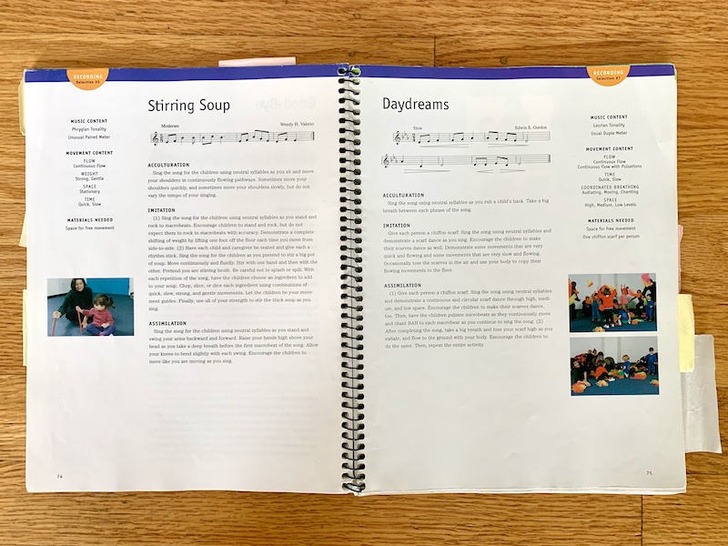The first third of the book is devoted to discussing music development and how teachers can go about structuring an early childhood music program. This lengthy reading section is worth the time to read and study. It contains a helpful overview of Gordon’s types and stages of “Preparatory Audiation” (read more about audiation here), which sets an important foundation for understanding how to use the songs, chants, and activity pages that follow.