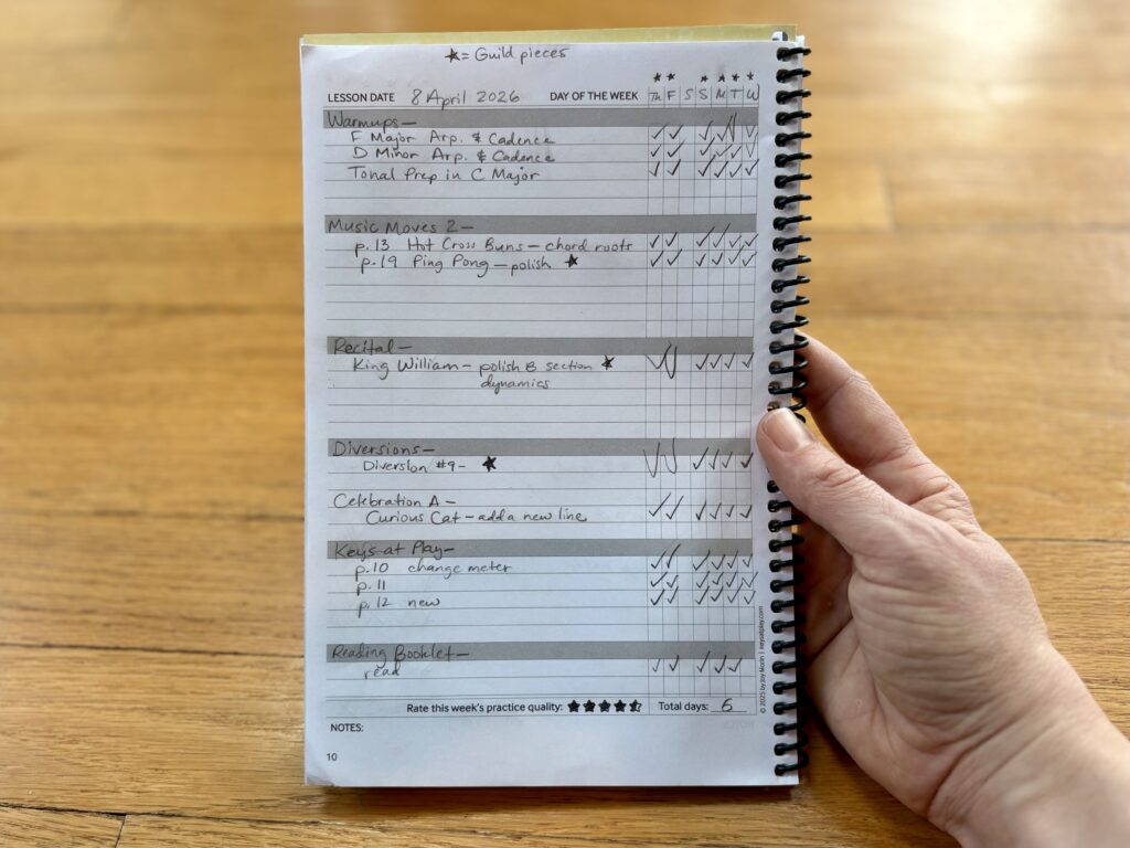 How so? The format of the planner supports the way I teach: it encourages students to practice in a goal-oriented way, and it gives me a clear way to communicate specific assignments I expect them to address during home practice. It’s a teacher tool and consistent support as I hold students accountable to making progress on the goals I’ve notated.